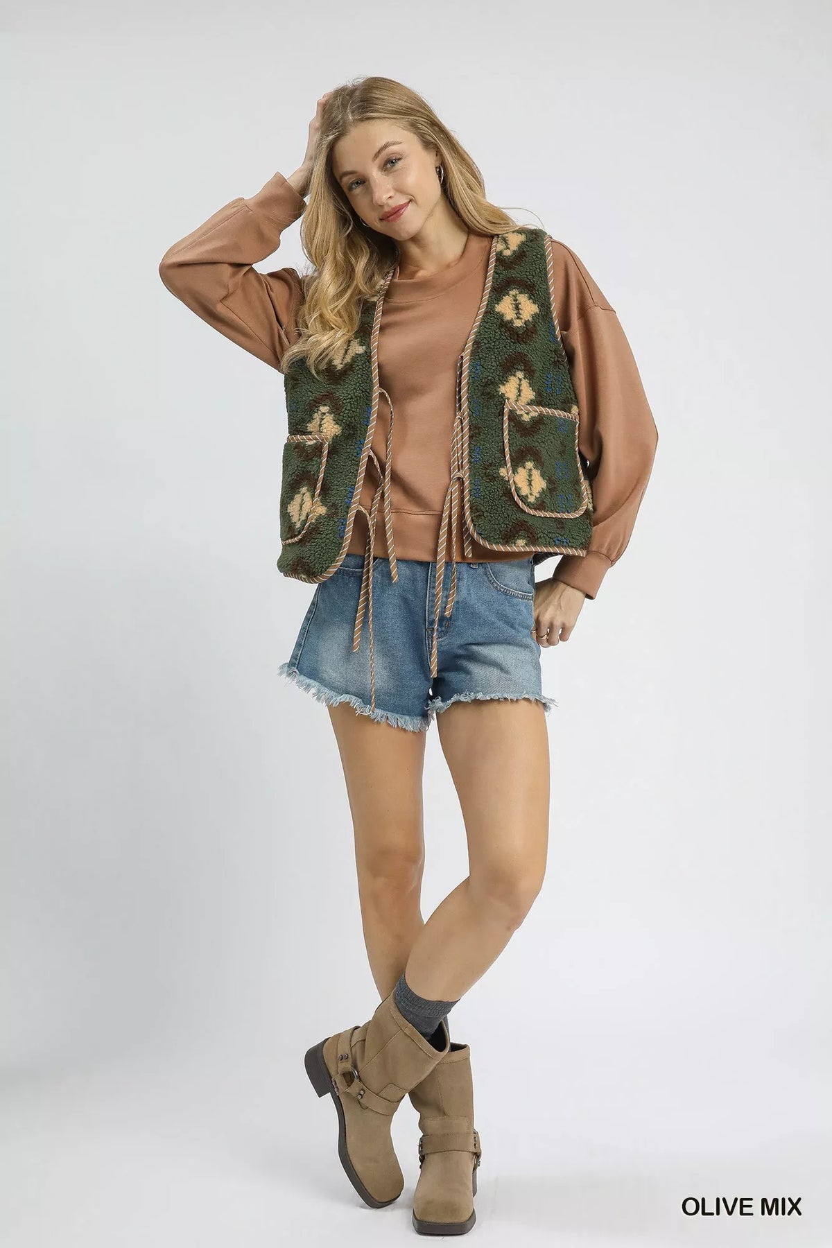 Umgee Mix Patterned Sherpa Tie-Front Vest