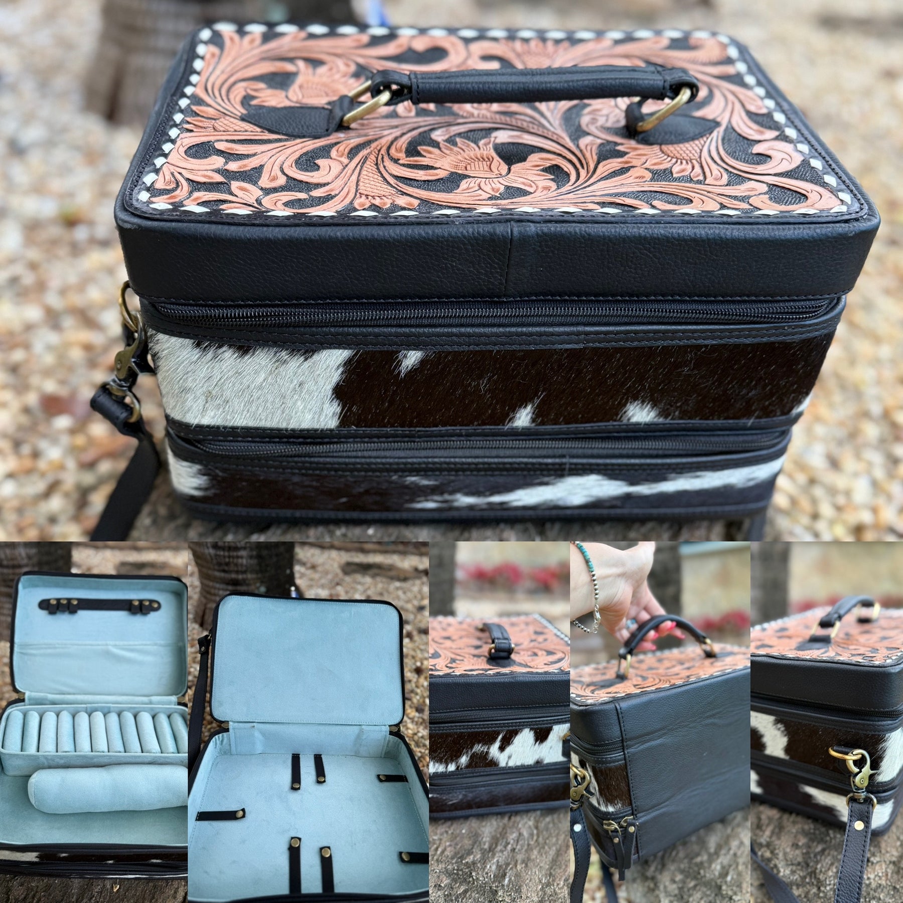 Double Decker Handmade Hair on Cowhide and Genuine Leather Large Jewelry Carry and Store Case