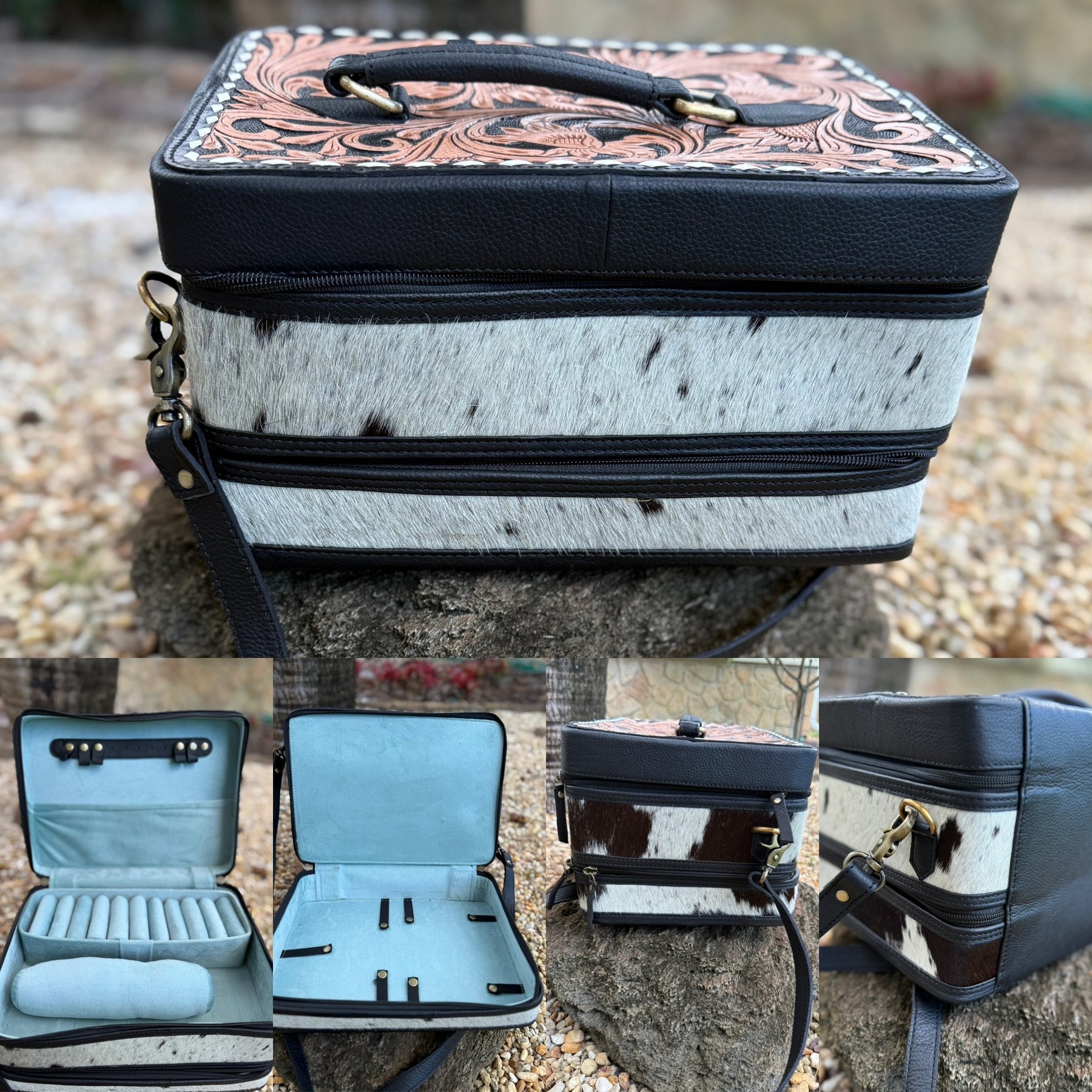 Handmade Black Leather and Black and White Cowhide Jewelry Case with 2 levels a top handle and Strap
