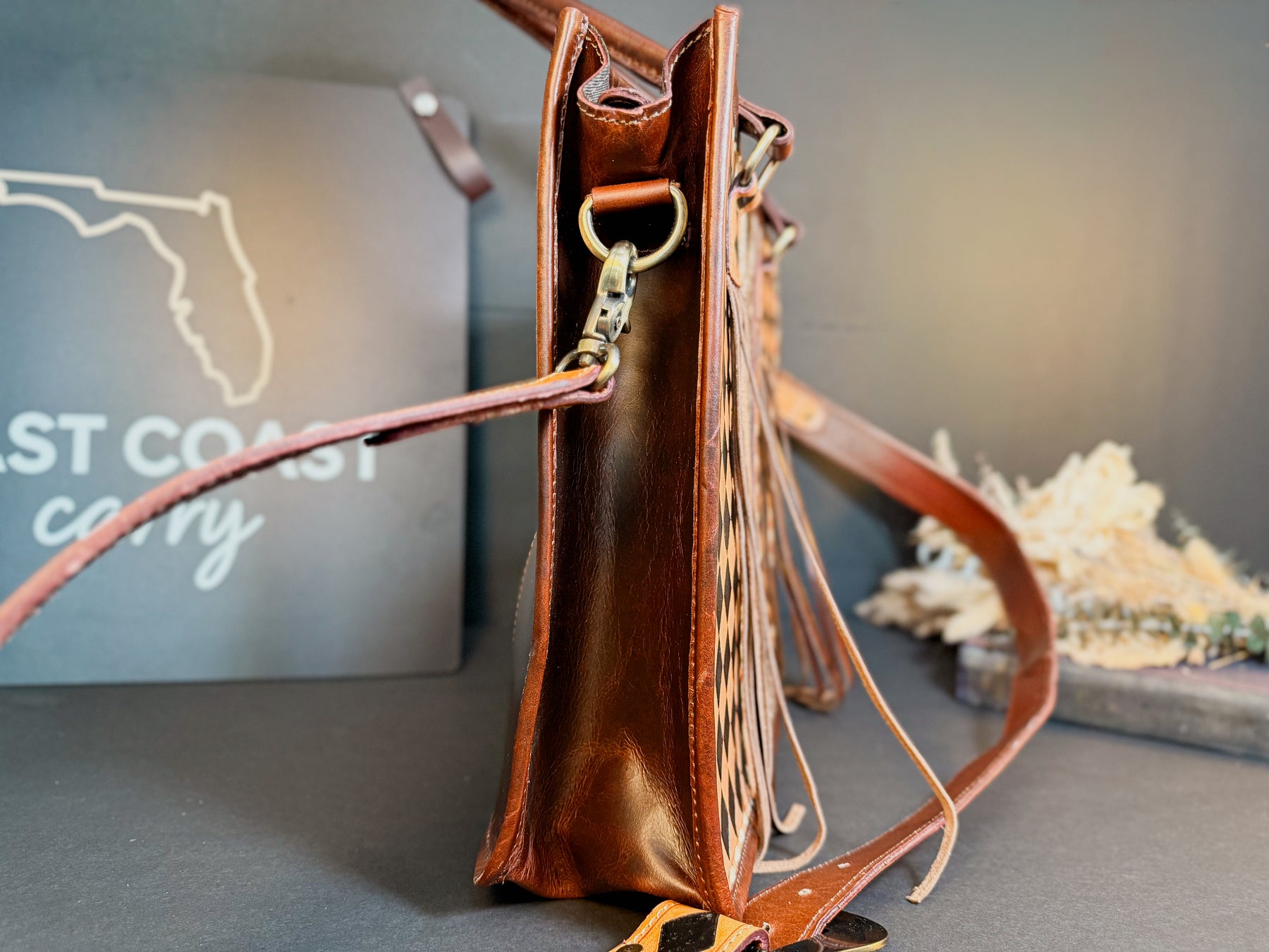Back view of concealed carry double zipper on checkered full-grain leather tote with cowhide detail