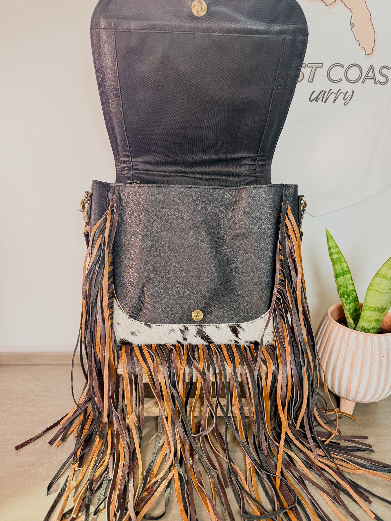 Daring, bold, and unapologetically Western — The Renegade is a genuine cowhide and leather fringe crossbody bag designed for women who carry grit with style. Measuring 12” x 11”, this handcrafted bag combines rich black leather with a contrasting cowhide panel and a hand-tooled floral strap that sets it apart from ordinary purses.