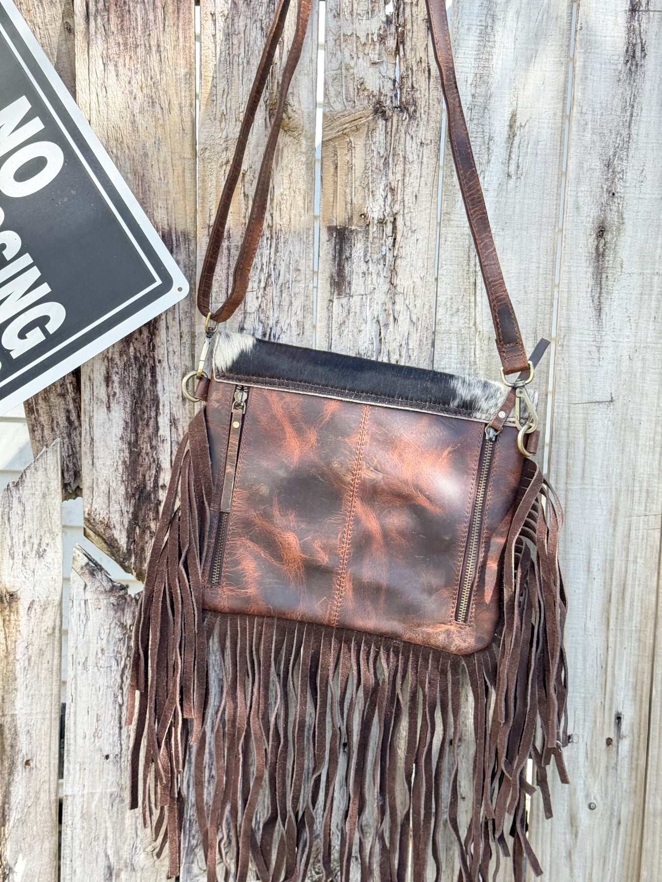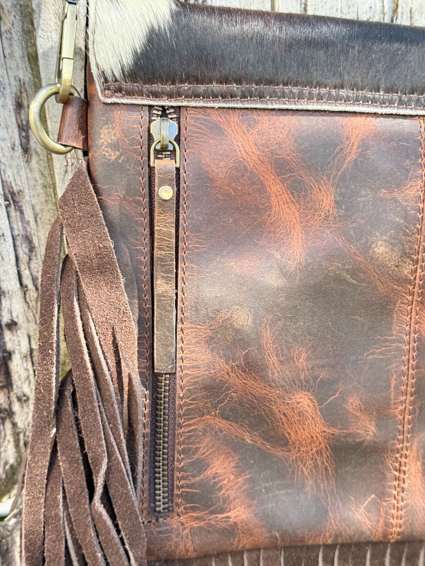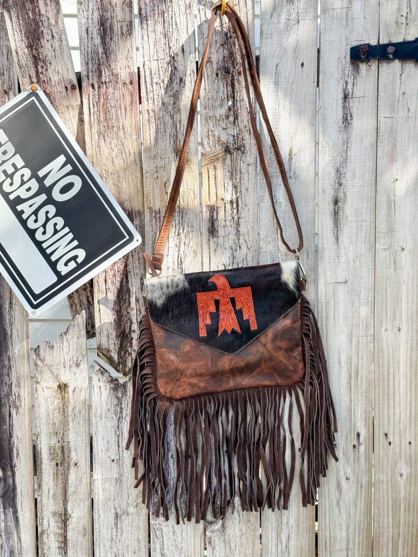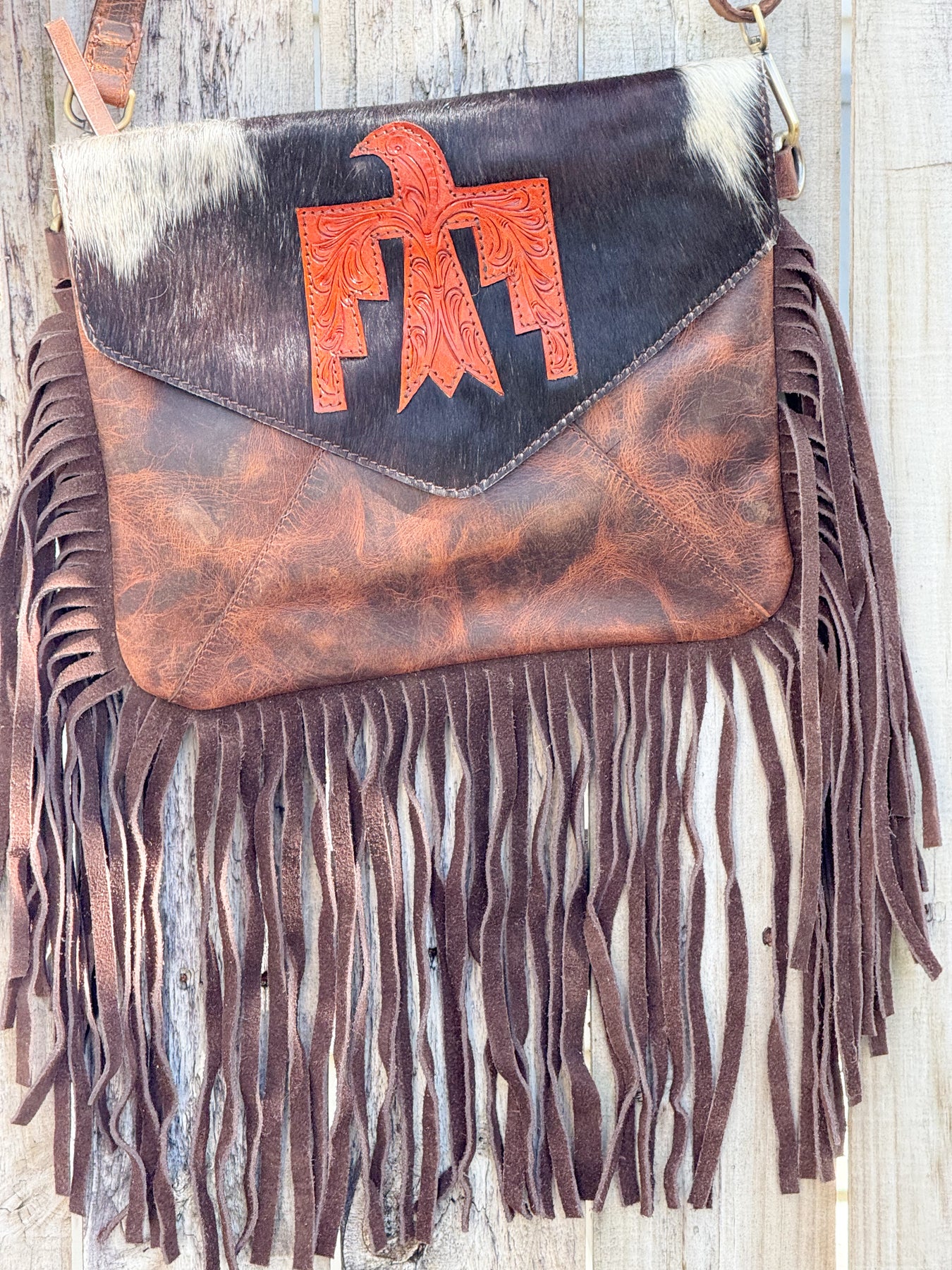 Thunderbird Design, High Quality Leather and Cowhide with  Fringe Crossbody Purse. Concealed Carry External Double Zipper Pockets on Back