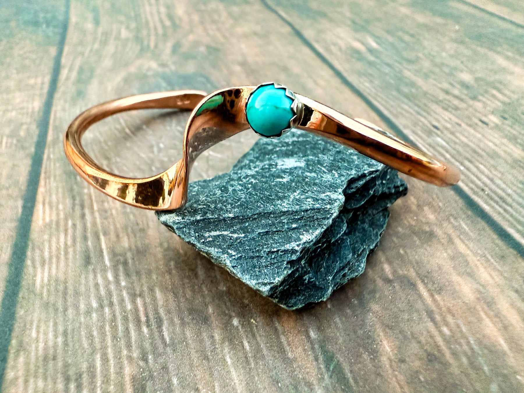 Authentic Native American–made copper cuff bracelet handcrafted by Glen Sandoval. This minimalist bangle features natural Kingman turquoise accents set into warm copper, creating an easy, everyday piece with Southwestern character.