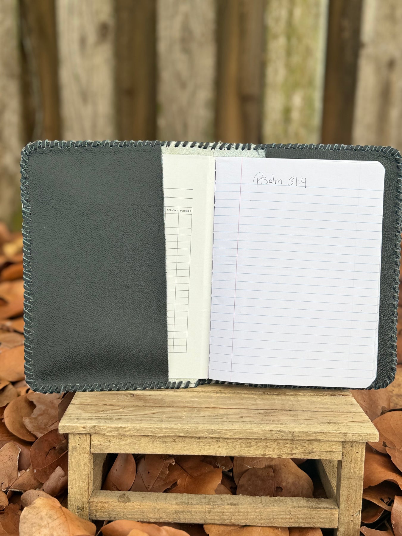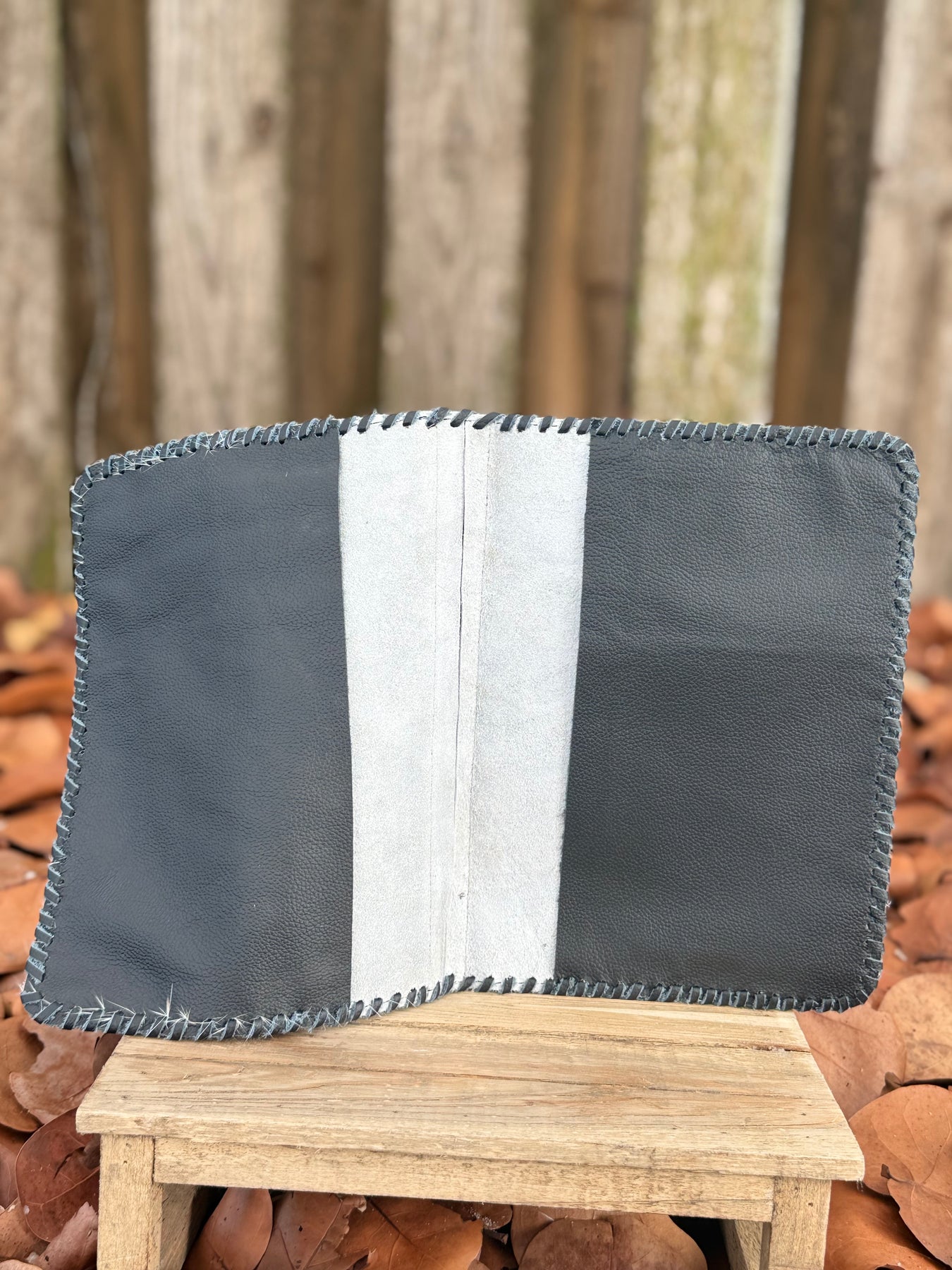 Hand-stitched with bold black leather and genuine cowhide, this handmade leather book sleeve is perfect for large Bibles, spiral-bound notebooks, and devotionals. Each one is unique in hide and made to last.