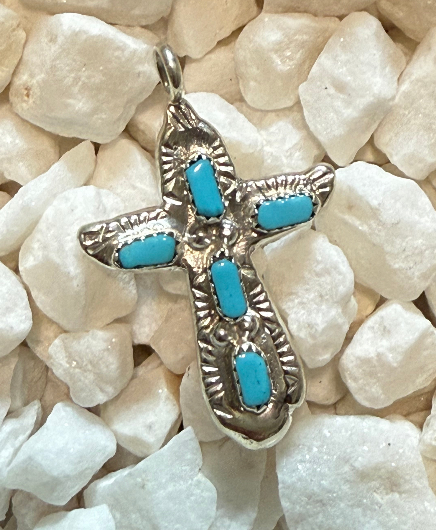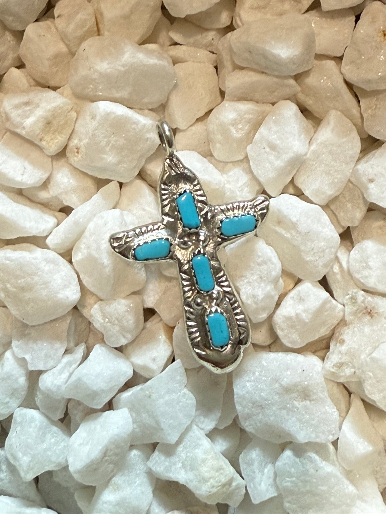 New Native American Zuni handmade Sterling Silver & Turquoise Cross Pendant signed