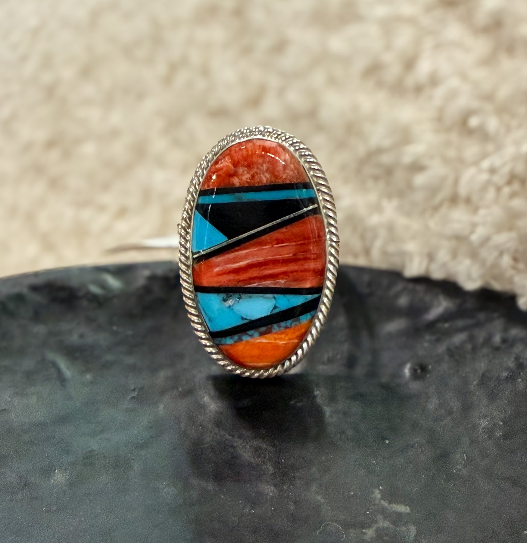 This colorful inlay design makes a beautiful statement ring or collector piece.