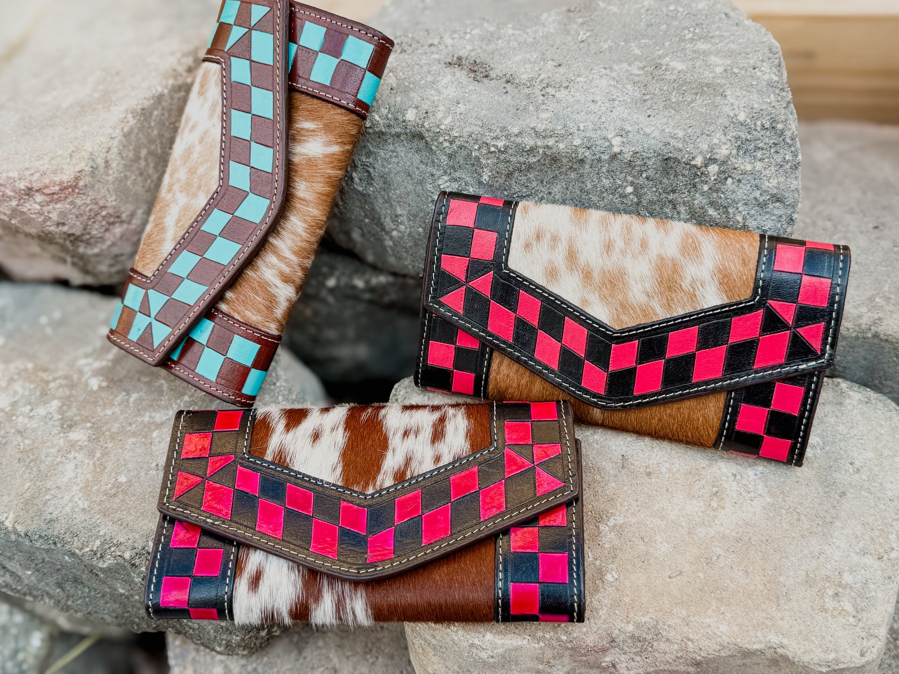 Bold, electric, and unapologetically different. Checkmate: High Voltage takes our signature checkered design and turns the volume all the way up — featuring hand-painted leather, genuine hair-on cowhide, and statement colorways made for neon cowgirls and bold women who don’t blend in.
