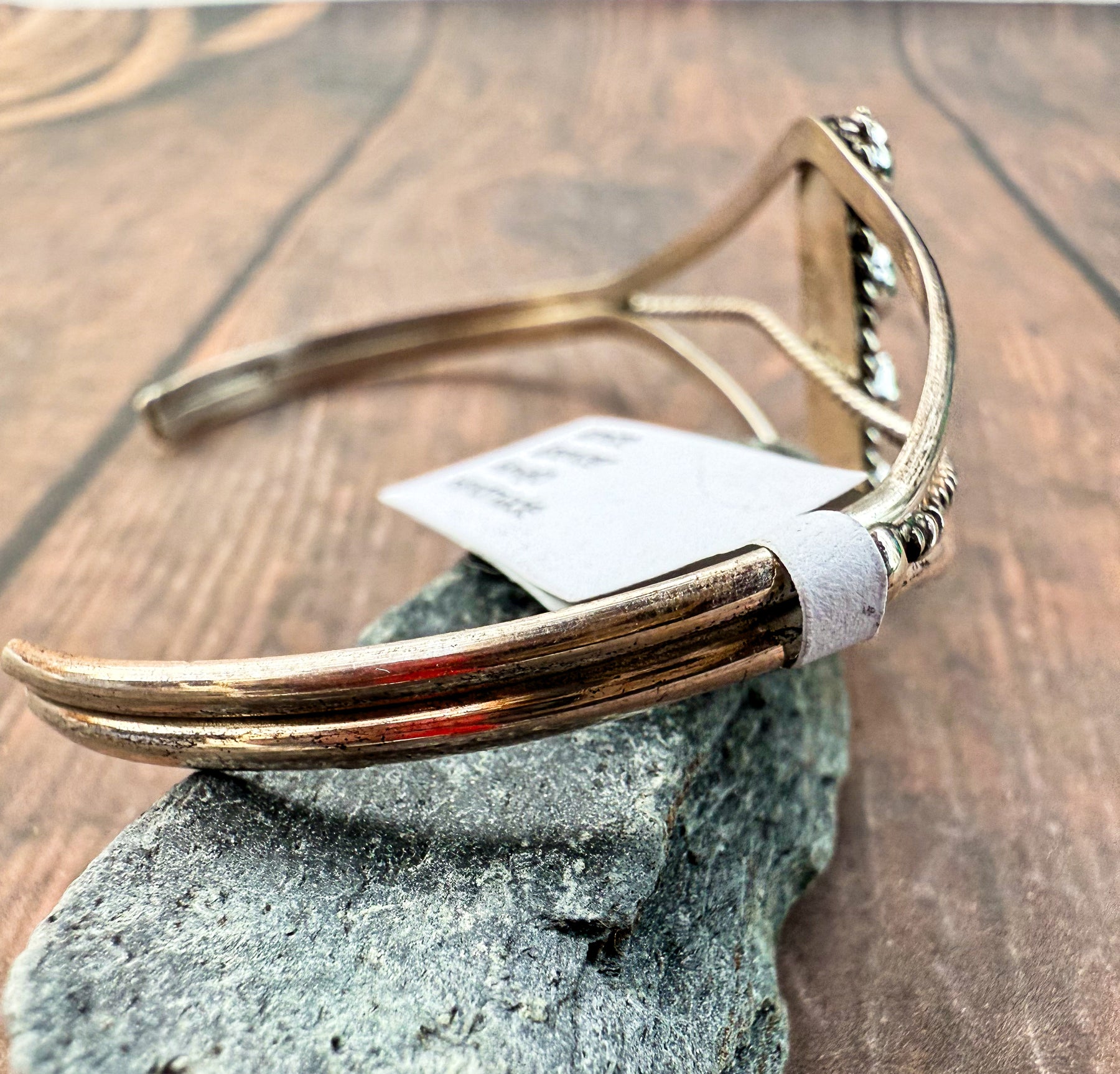Authentic Navajo-made sterling silver cuff featuring four Kingman turquoise stones set in a classic snake-eye style bar. The design is framed with petite twisted sterling rope detailing and finished with a sculptural, open cuff silhouette that gives it a strong yet feminine presence.