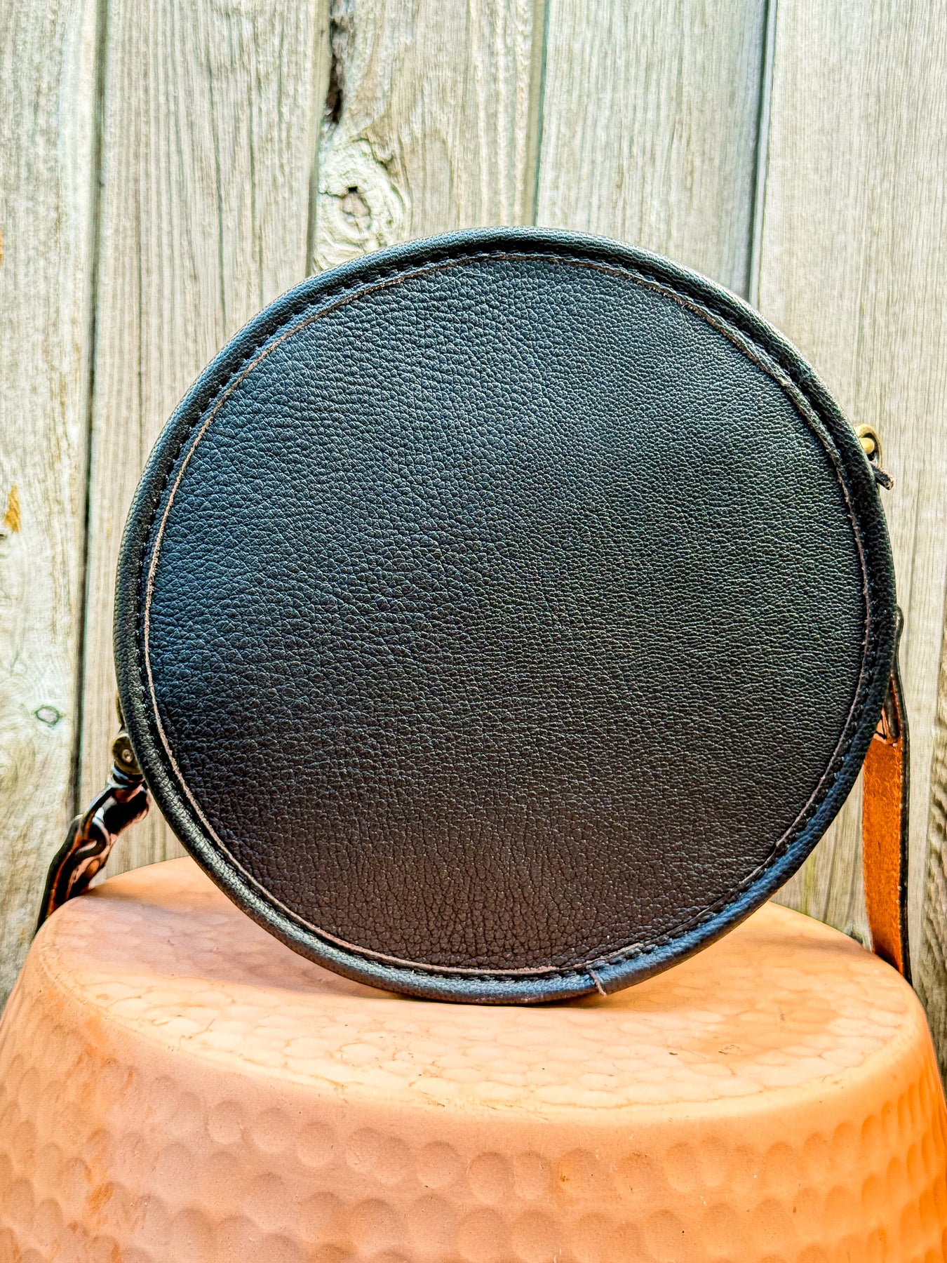 Meet the Speed Check Canteen Crossbody — a bold black leather round bag featuring a black & white checkered tooled leather hand painted border and a genuine cowhide front panel. Finished with a zip-top closure and adjustable strap for everyday wear with statement energy.