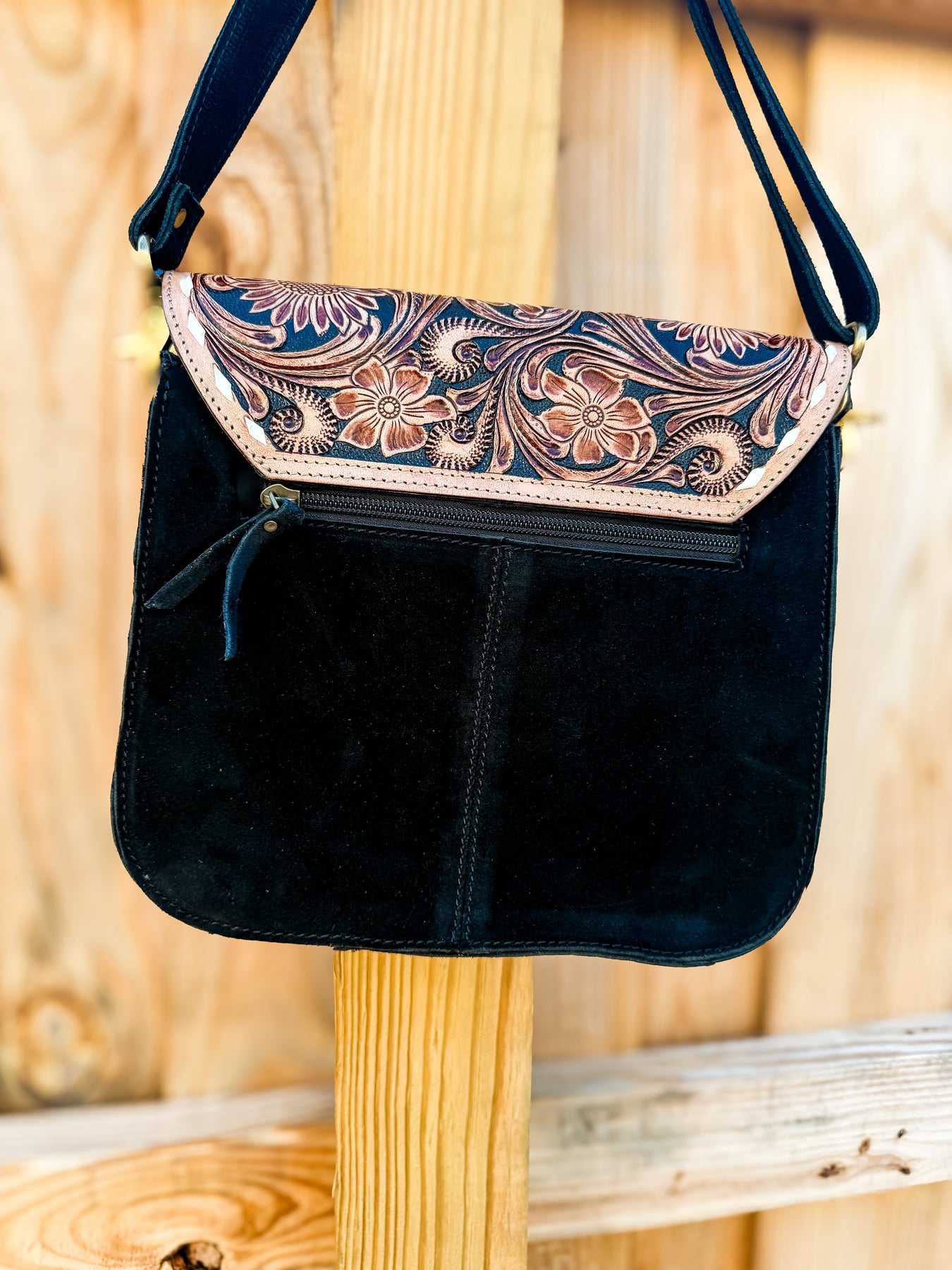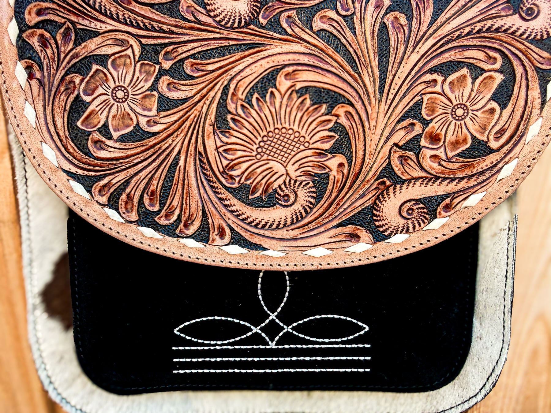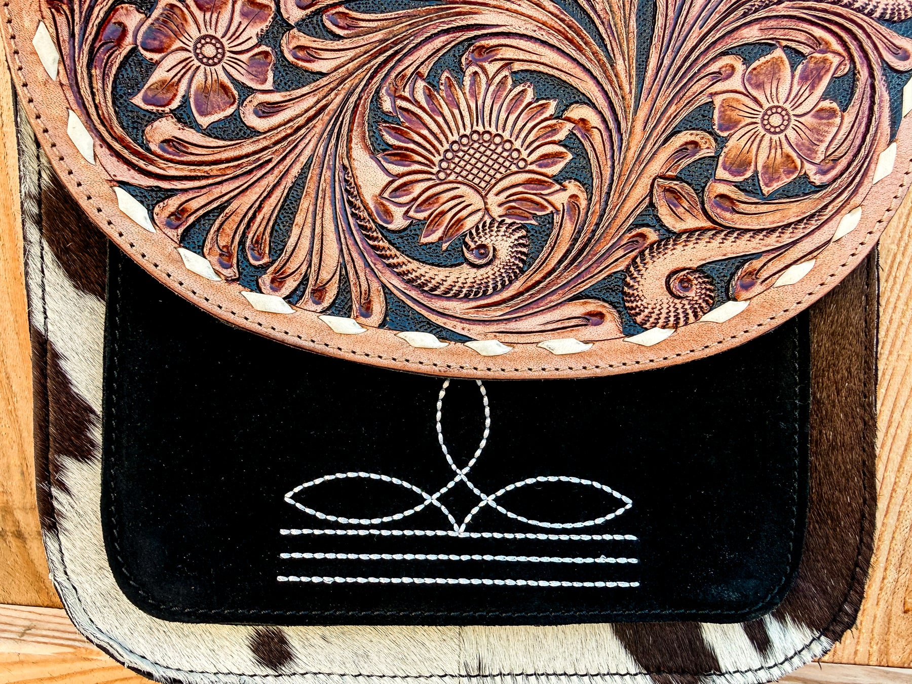 The Lee Tooled Boot Stitch Crossbody blends traditional western craftsmanship with everyday function. Featuring a hand-tooled genuine leather flap, authentic hair-on cowhide trim, and signature boot stitch detailing on black suede leather, this structured crossbody delivers timeless ranch-inspired style.