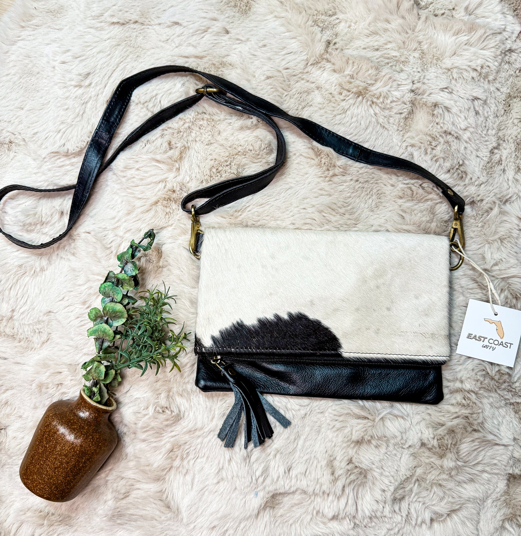 Hide Away Foldover – Cowhide & Black Leather Crossbody Clutch