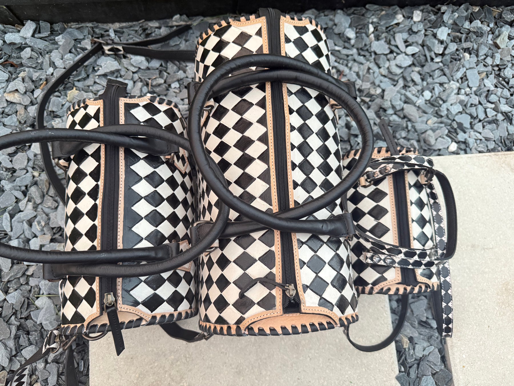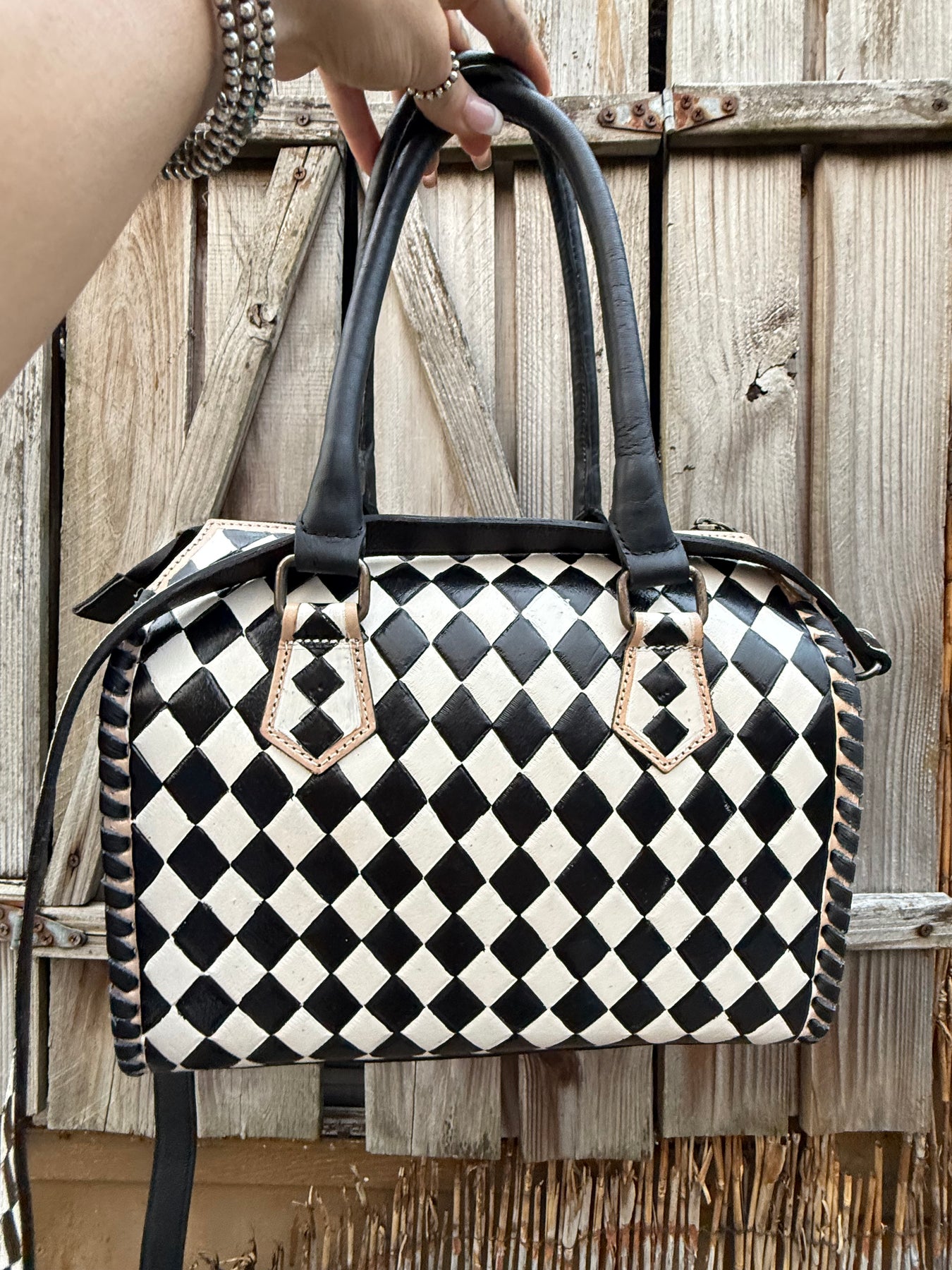 Each bag is hand-painted and tooled in a striking black-and-white checkered pattern, stitched with raw edge detailing, and built to turn heads. Whether you’re stepping out for everyday errands, traveling light, or carrying it all, this structured satchel blends function, style, and grit.