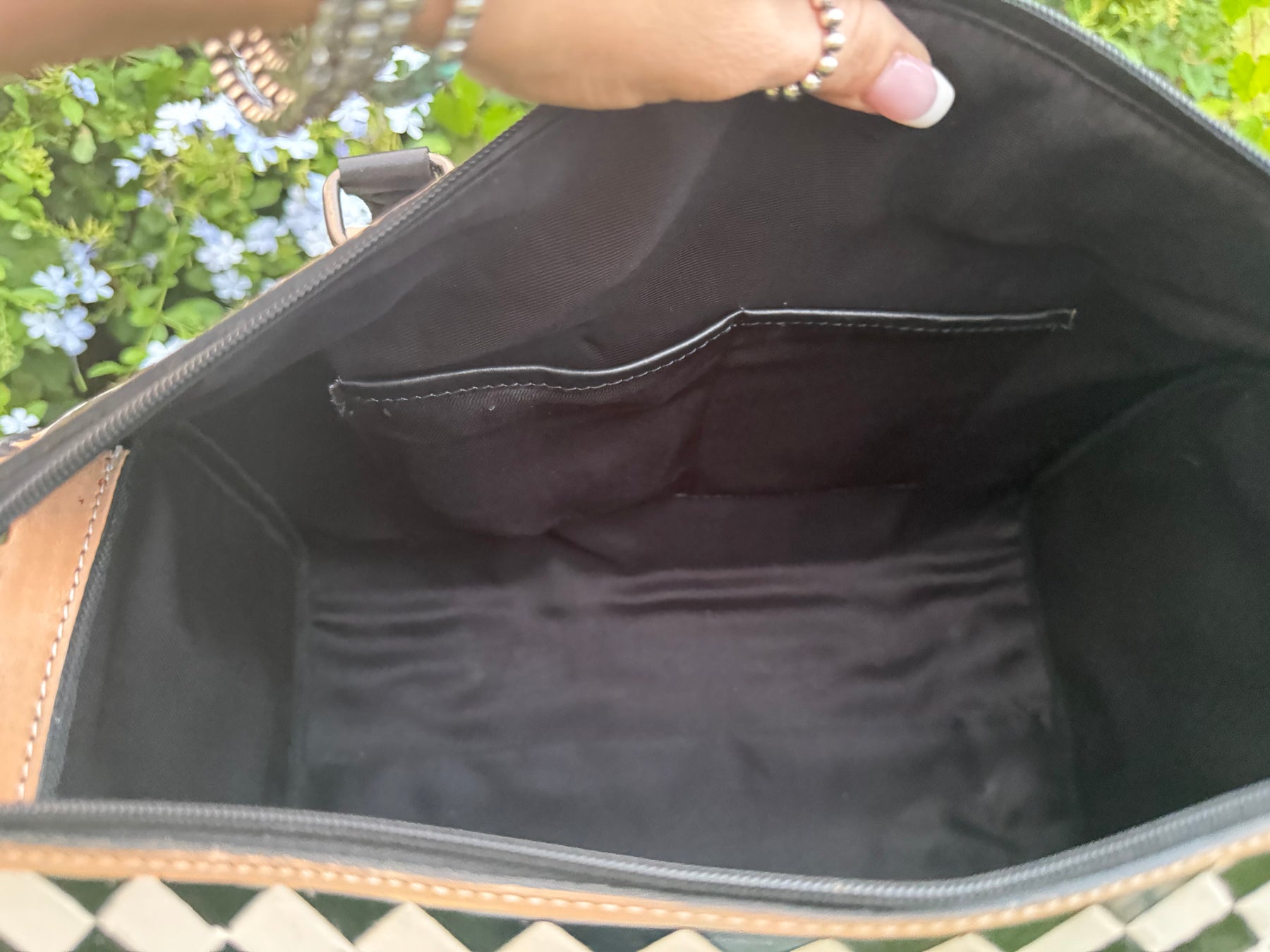 - Detachable & adjustable matching tooled checkered crossbody strap