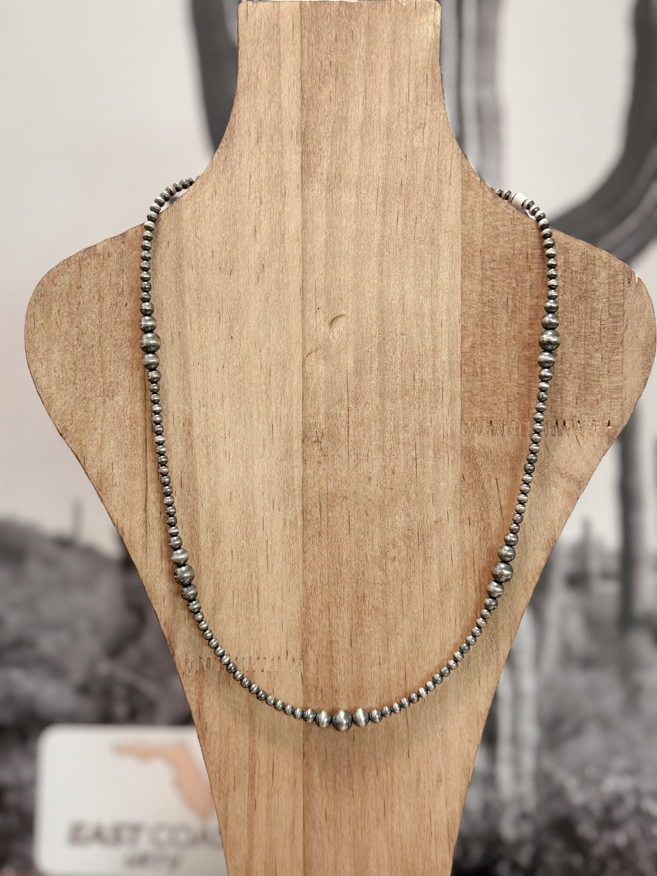 Timeless, hand-strung, and full of Southwestern soul—this 18” Navajo pearl necklace features a beautifully graduated design ranging approximately from 3mm to 6mm beads. Each oxidized sterling silver machine made bead is hand-strung, giving it an authentic, Native artisan-made feel with subtle variation that adds depth and dimension.