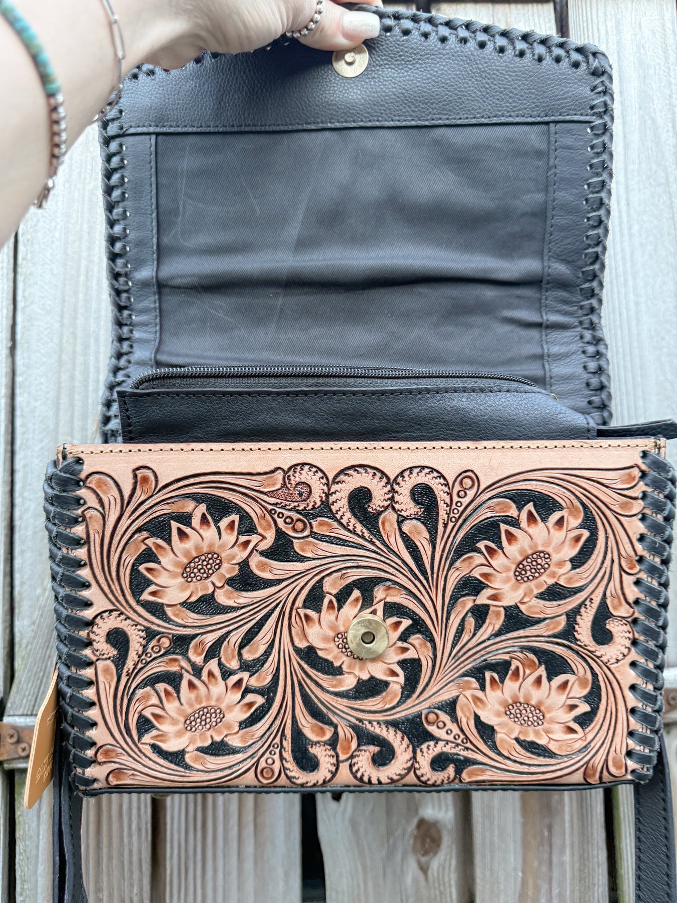 Black and Brown Tooled leather floral crossbody western purse with black whipstitch edge and adjustable strap